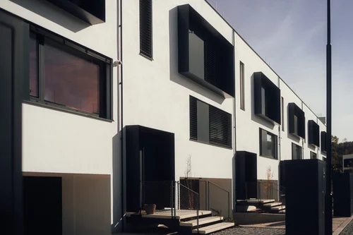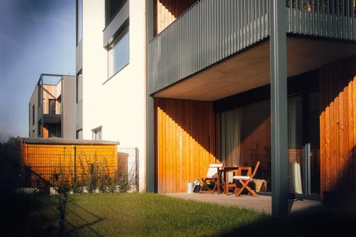 From the east side, there is an access road to the building with a car park. Here, the facade is simpler with smaller balconies and set back on the 1st aboveground floor, which allows for covered car parking and bike racks. On the west side, the building faces the park and there are terraces and larger balconies. On the north and south sides, the facade has greenery growing through it. Between the buildings, there is a passage to the park with greenery and a seating area. In terms of appearance, the building is a simple structure in a combination of white and anthracite plaster with wooden elements.
