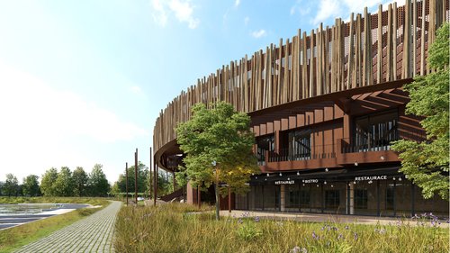 ENG: The building bears the name Bistro Dog in Dock. The name was retained from the original building. The newly-realised building will be part of the public space beside the Baťa Canal in the newly-reconstructed port complex in Veselí nad Moravou.