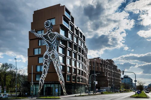 ENG: The investor contacted Black n’Arch studio with a proposal to connect two planned structures in an empty space on Lihovarská street in Vysočany. The buildings were designed by the Jiran a partner architekti studio. David Černý and Tomáš Císař then came up with the idea of being contextual – building on the legacy of factory owner Emil Kolben, who imprinted the industrial identity and world renown on this Prague neighbourhood. Materially, it is an artistic structure loosely inspired by the train derailment at Montparnasse railway station in Paris in 1895.